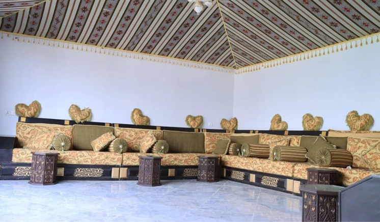 تتميز الخيمة بجلسات من الكراسي وتتميز ب اطلالة علئ الشالية والمجلس الملكي و ايضا الاشجار